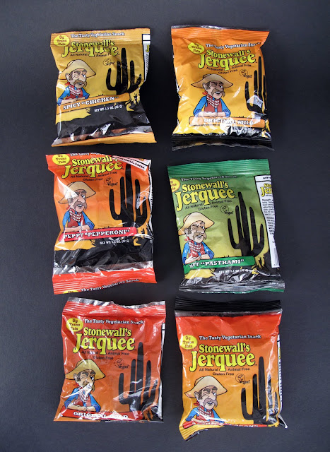 Stonewall Jerquee is personally my favorite. I like how small and chewable they are. Some have called it dogfood (Katie) but it tastes delicious to me. Let's put it this way, I bought the 5lb Original Mild bulk bag from Vegan Essentials, TWICE! The eight available flavors are Original Mild, Teriyaki "Beef", Tandoori "Chicken", Original Wild, Spicy "Chicken", Peppy "Pepperoni", Hot "Pastrami" and Cajun "Bacon".