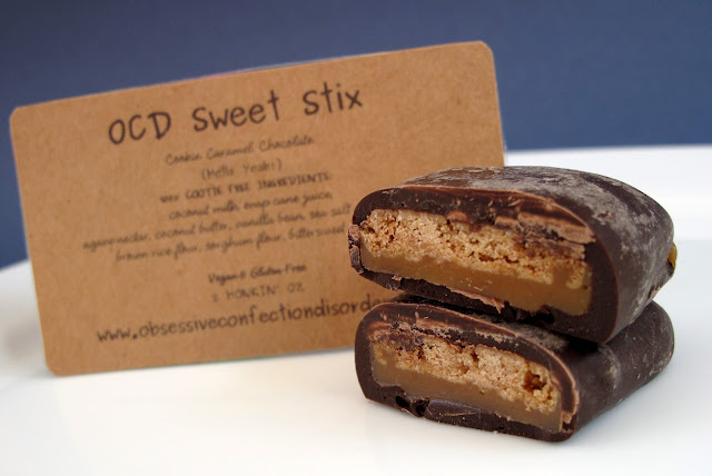 A couple of months ago, I was able to sample the amazing "Vegan Twix" from Obsessive Confection Disorder. They're called Sweet Stix and they're something I've been waiting a long time for! Twix was always one of my favorite candy bars, so I've been pretty bummed for the last 10 year or so. But thanks to Melodi, I can stuff my face with delicious Sweet Stix!