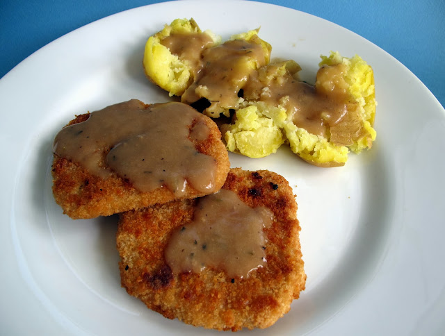 A quick 20 minutes in the toaster oven yielded probably my favorite Gardein meal EVER. I attribute some of that to the emotional connection, but holy crap is this cutlet ever good! Crisp, hearty and tasty; I would take this over any fake turkey roast any day. The cutlet does have a hint of turkey, but topped with the gravy, it just tastes like a damn good cutlet to me. Nicely breaded with four servings in a packet, it feels like a full meal, just add veggies. The gravy packets that come with are super easy to use. Thaw the packets in hot water, empty them and then microwave the gravy for a minute or two. My only complain is that I would have liked more gravy, but wouldn't we all?