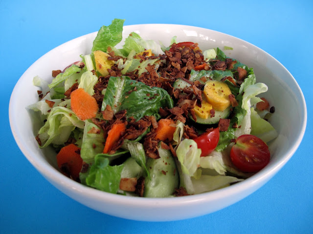 As you can see, it really livens up a salad! I love the size and the texture. A bonus is that the bacon flakes are soft and not hard like Bacon Bits. I've been putting them on my salad more often then not this summer. Probably not the most low fat option out there, but it's mega delicious and filling. If you want instant flavor, here you go!